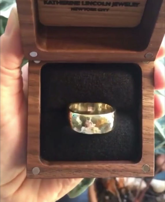 Hand carved thick classic cigar band style ring with hammered finish created by striking the hammer on the…