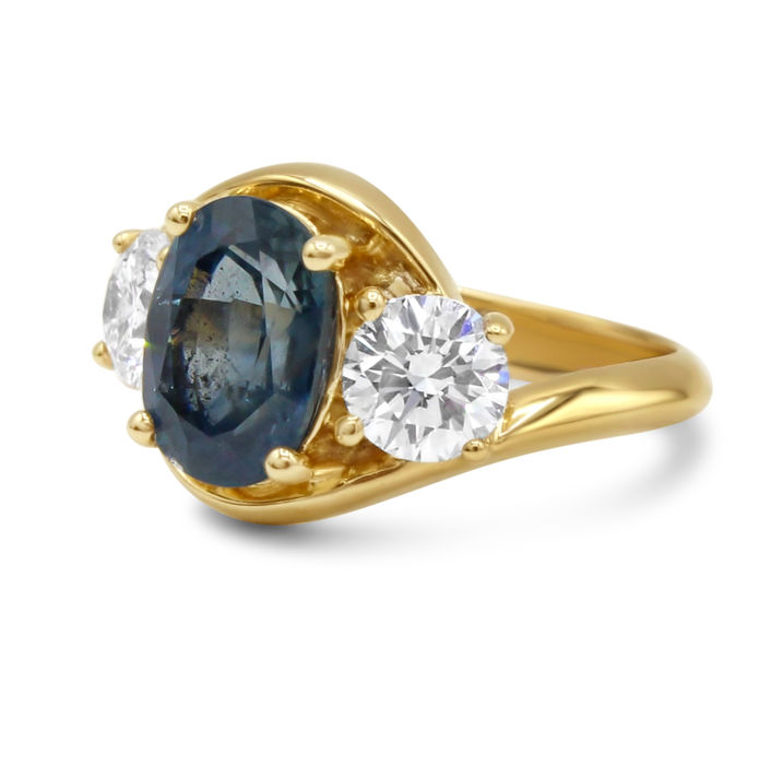 A stunner of a sapphire framed by sculptural waves that hug and cradle the stone. A symbol of the waves of life and the beauty in the journey. Set in a 14k yellow gold prong setting with 2 round diamonds framing the center for a perfect blend of classic and modern flair. Designed to be a forever perfect style to be worn for generations.