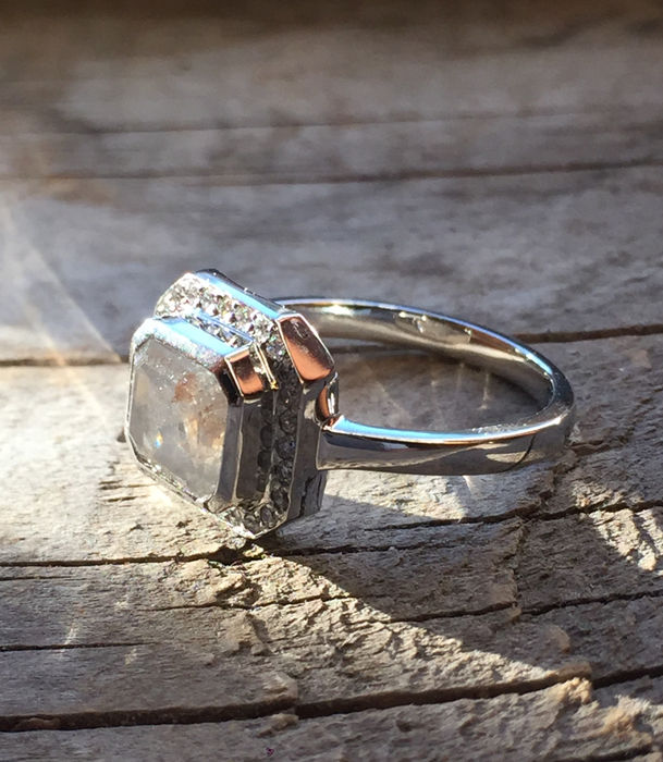 A unique cut salt and pepper diamond set in a hand carved setting and surrounded with tiny diamond pavé.